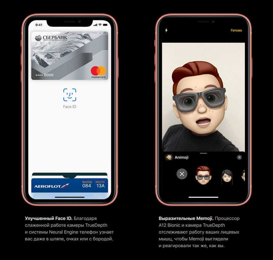 iPhone XR и iPhone XS поддерживают разблокировку экрана по лицу. Работает она достаточно быстро и точно даже в темноте. Скорее всего, это заслуга хорошего процессора и улучшенных камер.