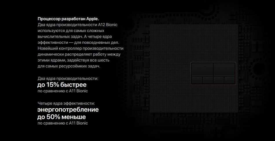 На устройствах стоит процессор A12 Bionic c новым 8-ядерным чипом Neural Engine. Графика превосходит в скорости смартфоны предыдущих поколений.