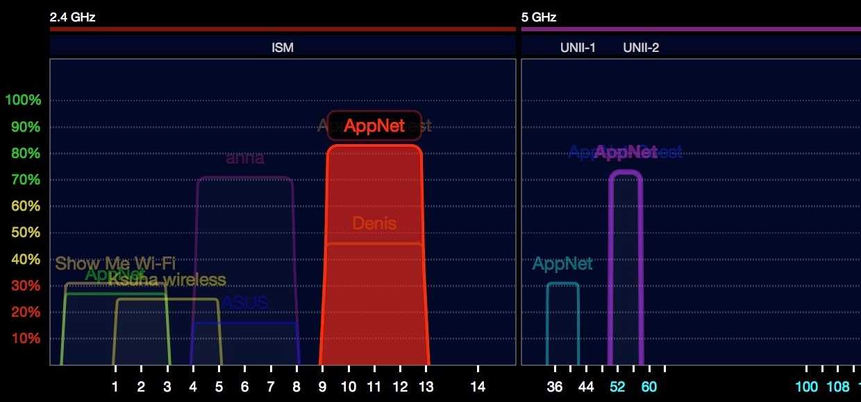 Первое, что я сделал — просканировал все углы помещения WiFi Explorer и убедился, что везде есть хороший сигнал в диапазоне 2,4 ГГц (диаграмма выше). Но отключать «чистый» 5 ГГц совсем не хотелось. Решение нашел такое.