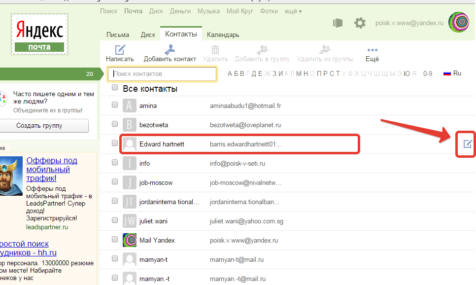 Для редактирования контакта кликаем в любом месте с его именем или электронным адресом.