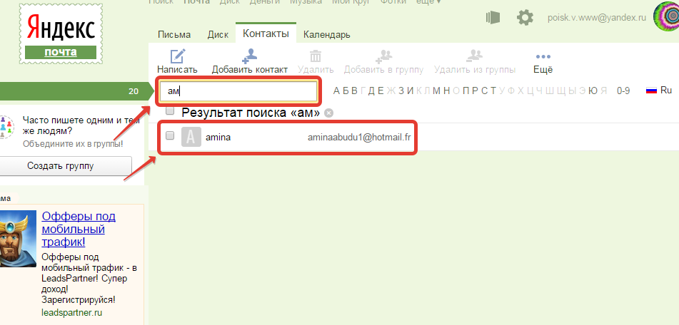 Для поиска определенного пользователя в наличии имеется поисковая строка. Вводим начальные буквы имени или электронного адреса и Яндекс убирает из списка лишние контакты.