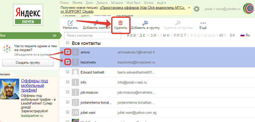 Для удаления одного или нескольких контактов, выделяем флажком в чек-боксе и нажимаем «Удалить контакт».