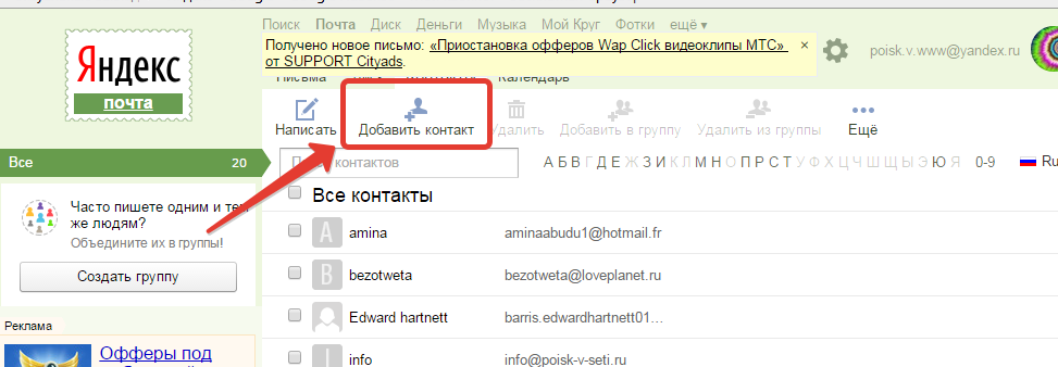 Переходим в раздел «Контакты», переход осуществляется с помощью ссылки в верхней панели из основной страницы электронной почты на Яндексе.