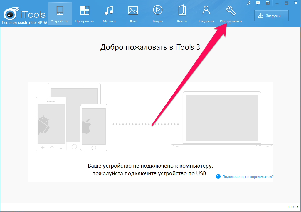 - Когда гаджет отобразится в iTools, переходим в раздел «Инструменты».Увеличить