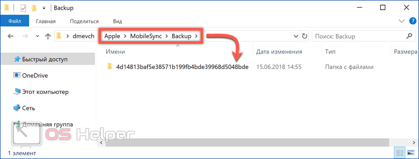 Последовательно открываем вложенные в нее папки, следуя по отмеченному рамкой пути. Нужная нам резервная копия iPhone будет храниться в директории «Backup». Папка с ней указана стрелкой на скриншоте.