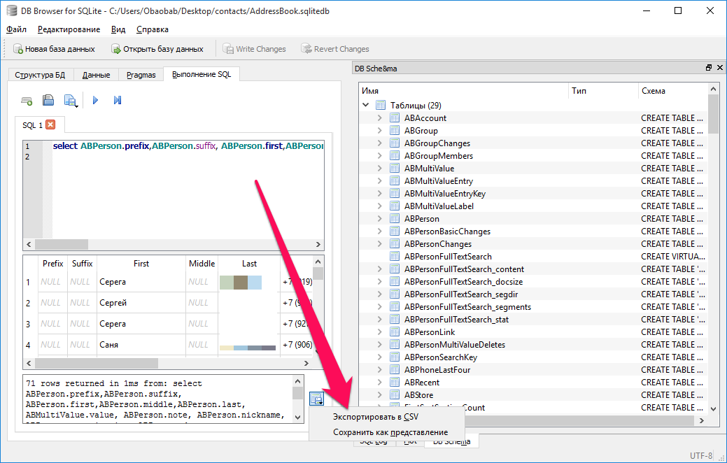 Как конвертировать контактную книгу .sqlitedb в .csv