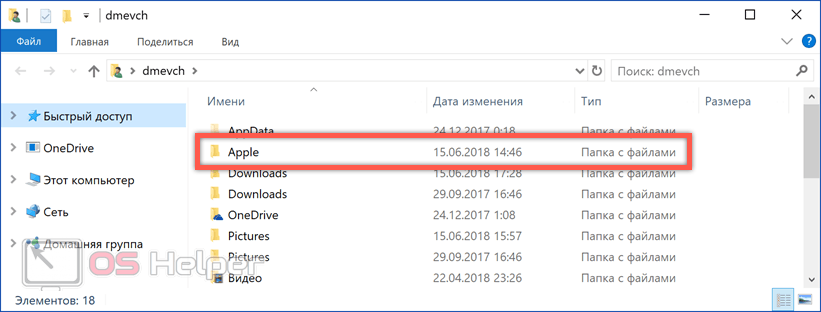 В окне Проводника в этот раз нужно искать директорию «Apple».