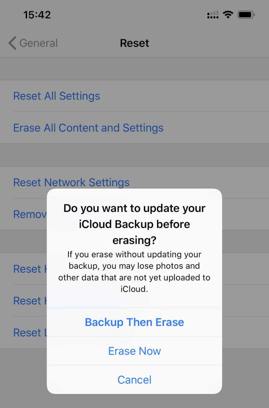 Шаг 3. Нажмите на Стереть контент и настройки, iOS предложит вам сделать резервную копию вашего устройства, иначе вы потеряете все данные, которые еще не были скопированы.