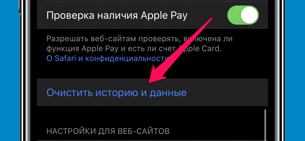 С помощью системных параметров (для Safari). Здесь всё несколько проще, следуйте инструкции: открываем «Настройки» → «Safari» → «Очистить историю и данные»