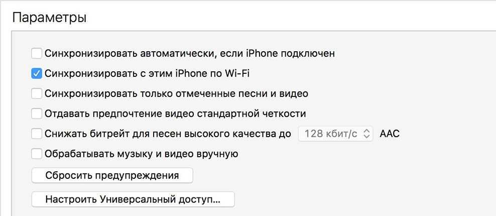 - Прокрутите страницу вниз до раздела «Настройки» и установите флажок «Синхронизировать с этим iPhone через WiFi»;