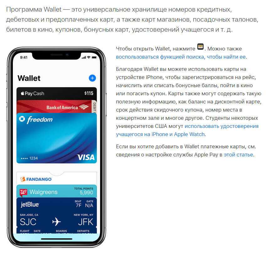 Apple Wallet — мобильное приложение, встроенное в операционную систему iOS, которое позволяет пользователям хранить в нем различные карты, включая кредитные, дисконтные, а также билеты на всевозможные мероприятия (кино, театр, концерт).
