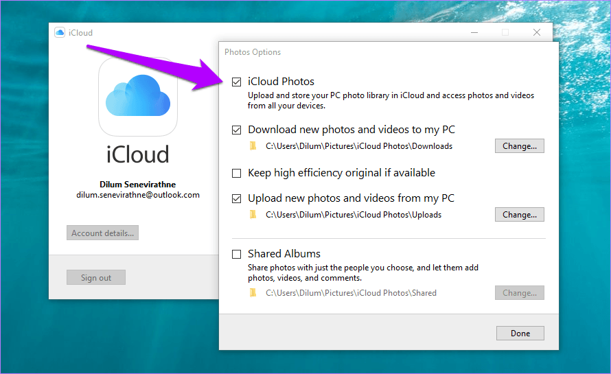 В Windows откройте приложение iCloud. Затем нажмите «Параметры» рядом с «Фотографии», а затем установите флажок рядом с «Фото iCloud».