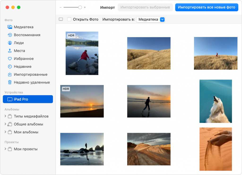 · Откройте на нем приложение «Фото», где у вас откроется окно «Импорт» со всеми фото и видео, которые находятся на подключенном аппарате. Если окно не появилось автоматически, нажмите на боковой панели на имя устройства;