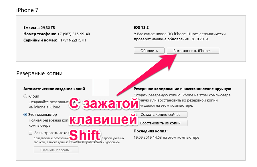 Важно! Еще раз предупреждаем о важности создания резервной копии. Описанная ниже процедура предусматривает удаление всех данных с iPhone с последующим восстановлением из заранее созданной резервной копии