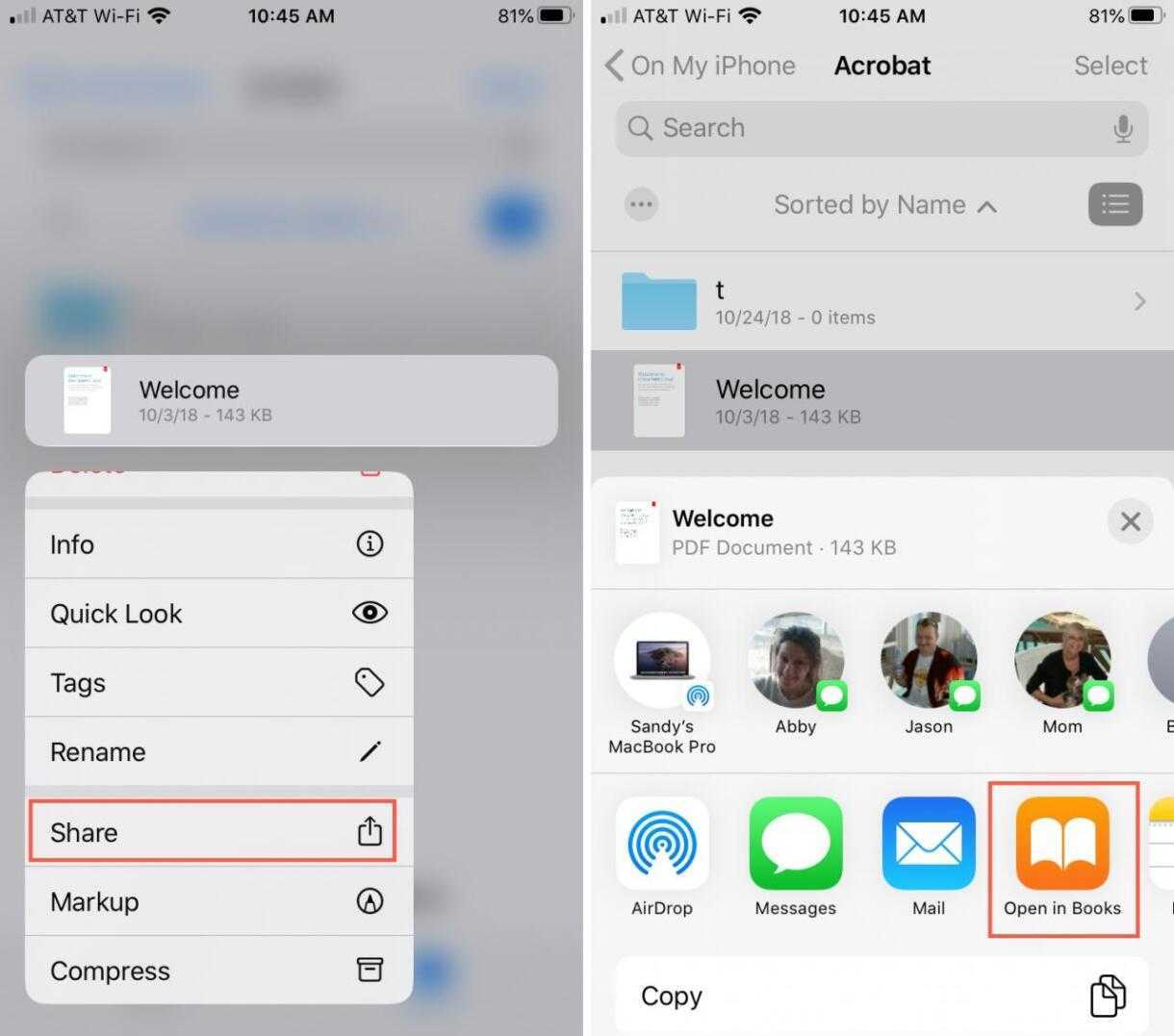 Независимо от того, переименовали вы PDF-файл или нет, вы можете легко поделиться им с помощью различных служб. Снова нажав и удерживая файл и ожидая открытия параметров, вы обнаружите «Поделиться» а затем вы можете отправить PDF-файл через AirDrop, Messages или через множество других приложений, которые вы установили. Даже так ты можешь распечатать это и даже экспортировать его в приложение для чтения и записи PDF.