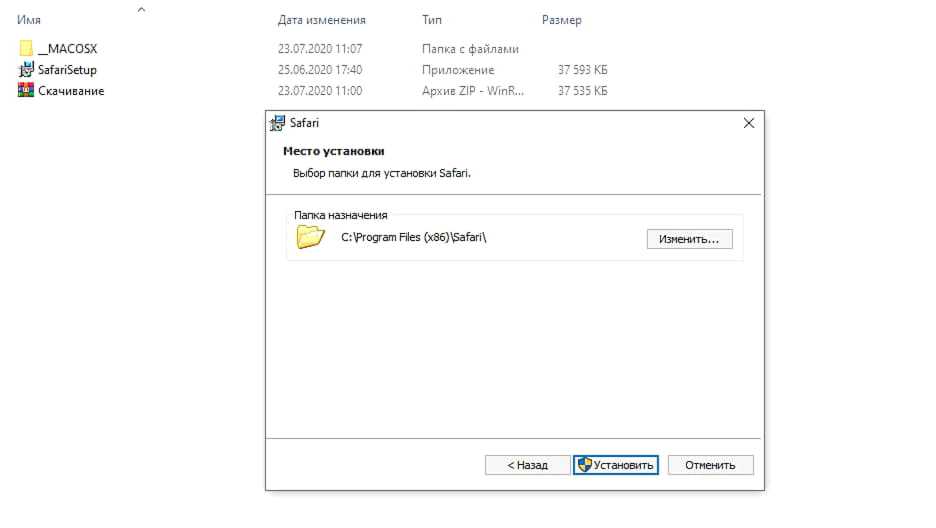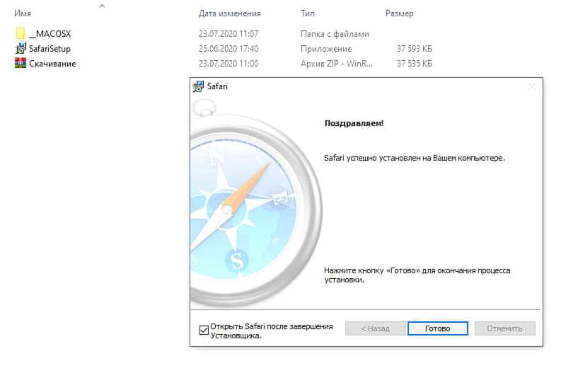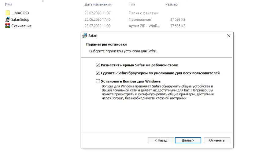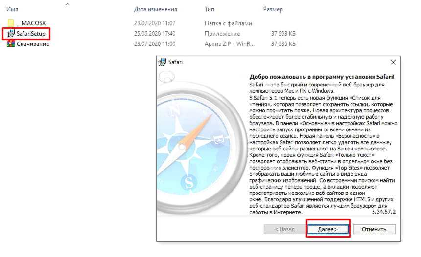 5. Разархивировав файл, у вас появится установочный файл «SafariSetup» для Windows и папка MACOSX, где содержится установочный файл для пользователей компьютеров Mac. Запустите «SafariSetup» для операционной системы Windows, который располагается не в папке, а отдельно, и кликните «Далее»: