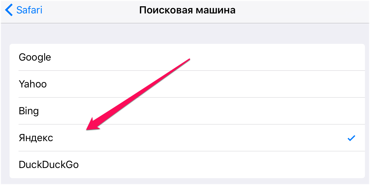 Готово! Теперь поисковиком по умолчанию в браузере Safari является «Яндекс». Отметим, что в этом же меню в качестве основного поисковика можно выбрать и другие популярные системы, например, Yahoo, Bing или анонимный DuckDuckGo.