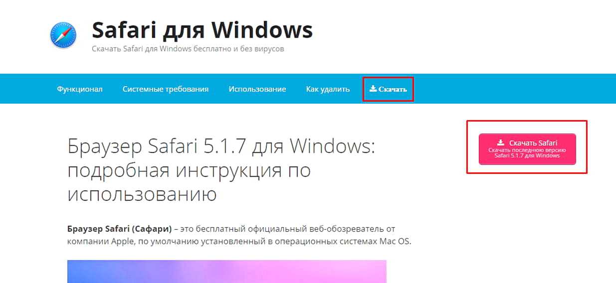 Сейчас последней версии Safari для Windows 7, 10 и других современных продуктов Microsoft не существует. Поэтому можно лишь скачать устаревшую версию Safari для Windows с официального сайта.
