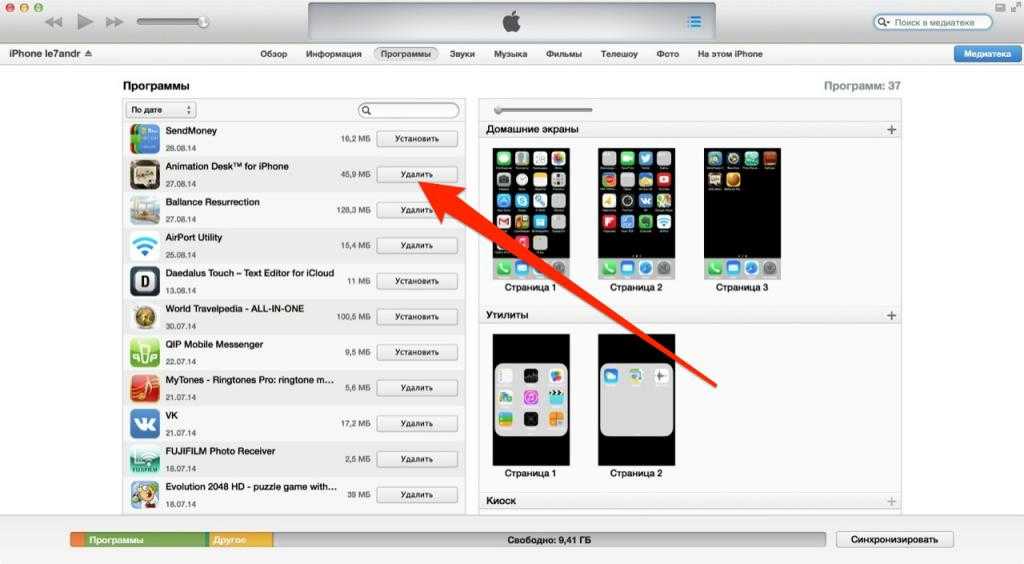 Третий способ предполагает использование iTunes на компьютере. Устройство подключают и выбирают его в медиатеке. Теперь переходят в «Программы» и удаляют нужное. В самом конце не забывают о синхронизации.