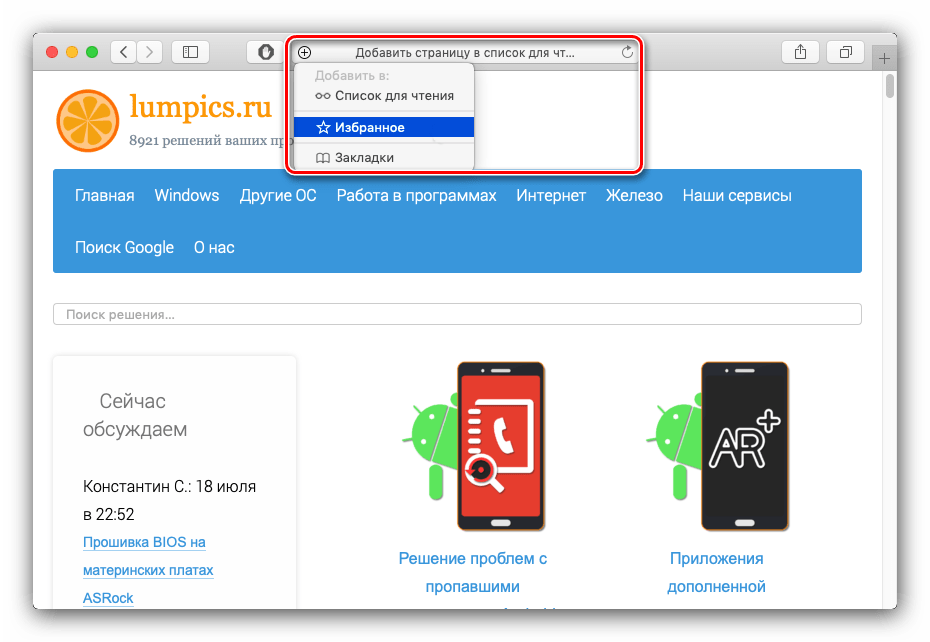 Добавление сайта в «Избранное» в Safari на macOS и iOS