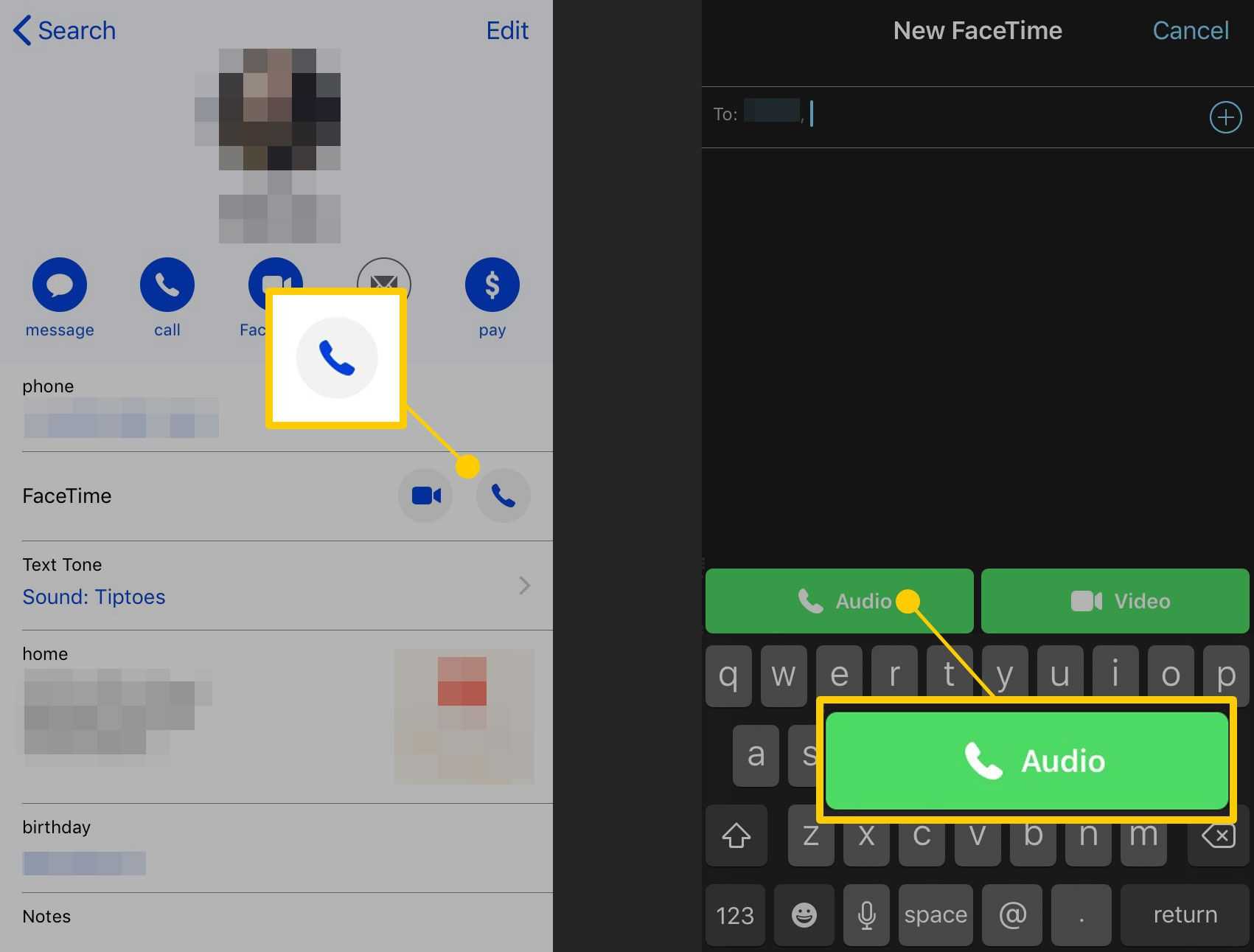 На iOS 7 или выше вы можете сделать аудиозвонок FaceTime. Вы увидите значок телефона в разделе FaceTime на странице контакта или в качестве опции в приложении FaceTime. Коснитесь значка « Телефон», чтобы начать аудиозвонок.