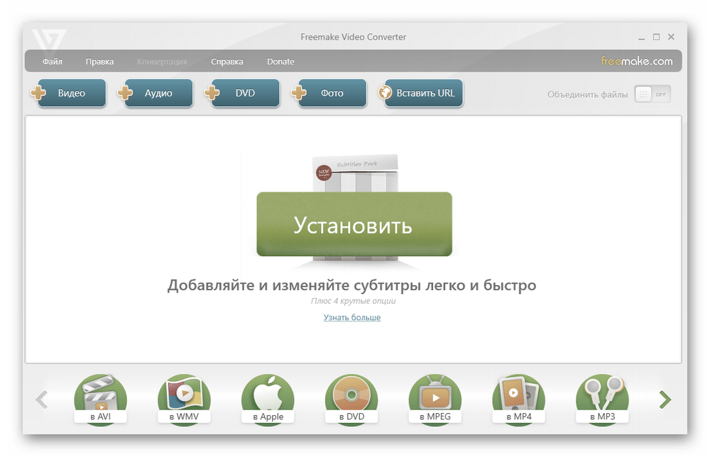 Установив программу, откройте её и нажмите на «Добавить файлы», чтобы выбрать заранее скачанный ролик. Программа поддерживает множество форматов, но перед началом работы нужно убедиться в том, что видео относится к одному из них. На сайте ПО есть полный список.