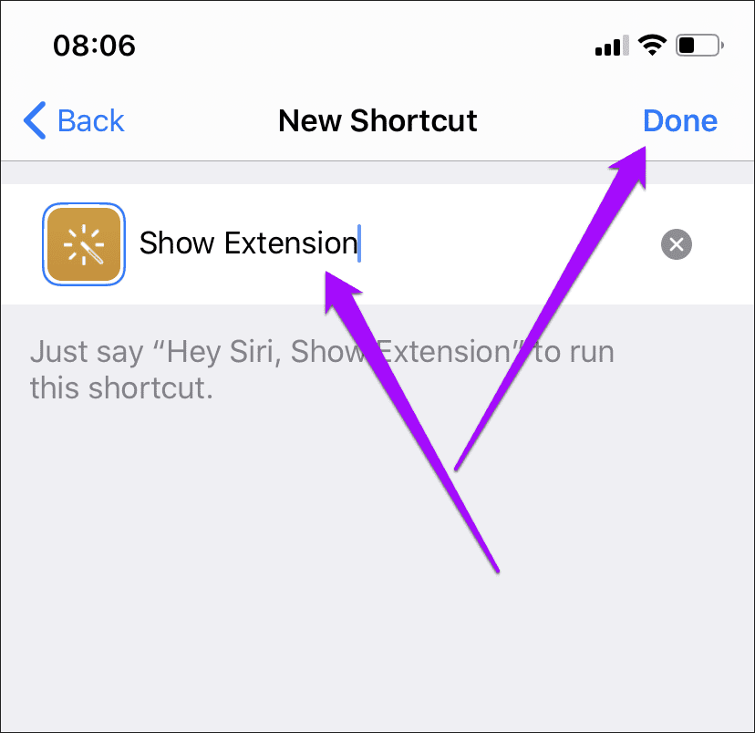 Шаг 5: Добавьте имя для ярлыка (например, «Показать расширение»), а затем нажмите «Готово».