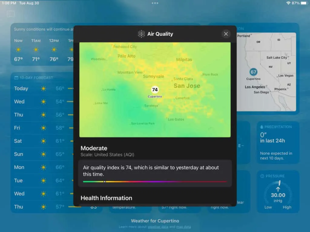 Если вы выберете модуль, вы увидите всплывающее окно с еще более подробной информацией. Например, если вы откроете модуль качества воздуха, вы увидите карту качества воздуха, краткое описание текущего AQI (индекса качества воздуха), информацию о здоровье и основной загрязнитель.