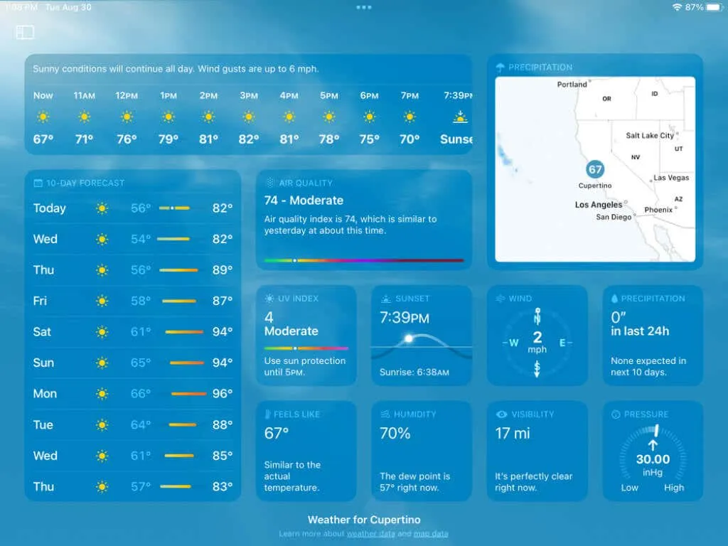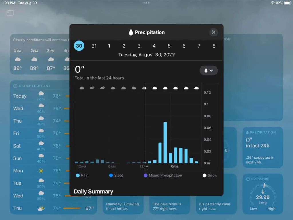 Каждый модуль, который вы видите, содержит необходимую информацию. К ним относятся почасовой прогноз, прогноз на десять дней, радиолокационная карта, качество воздуха, УФ-индекс, закат, ветер, осадки, ощущения (температура), влажность, видимость и давление.