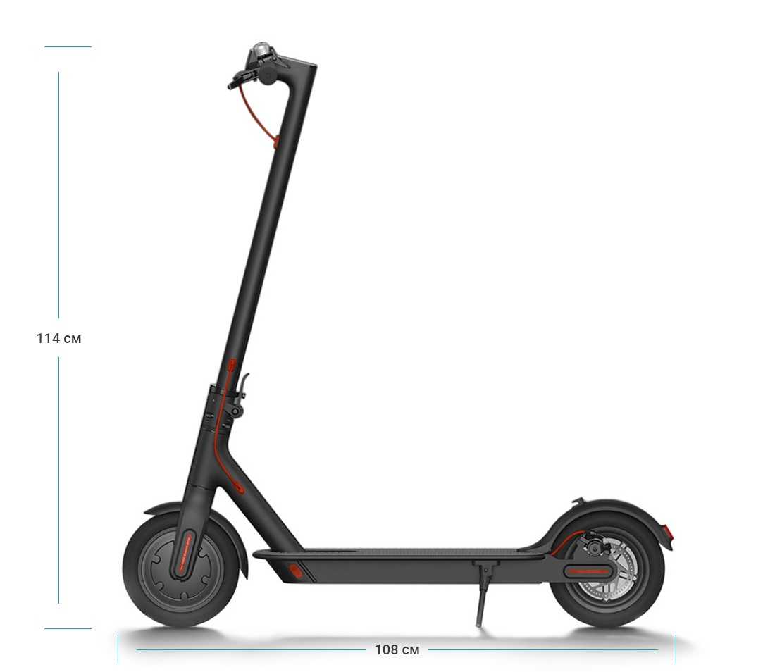 Общая масса всей конструкции находится на уровне 12,5 кг, а потому много физической силы для поднимания по ступенькам не понадобится. Достоинство можно наблюдать в складном стиле, поскольку изменение формы занимает лишь три секунды. В зависимости от состояния меняется и высота самоката, составляющая в сложенном виде 49 см, а разложенном – 114 см. В длину и ширину габариты устройства составляют 108 и 43 см соответственно, приём можно наблюдать позитивное качество в лице присутствия подножки, за счёт которой можно легко оставить транспорт в вертикальной позиции.