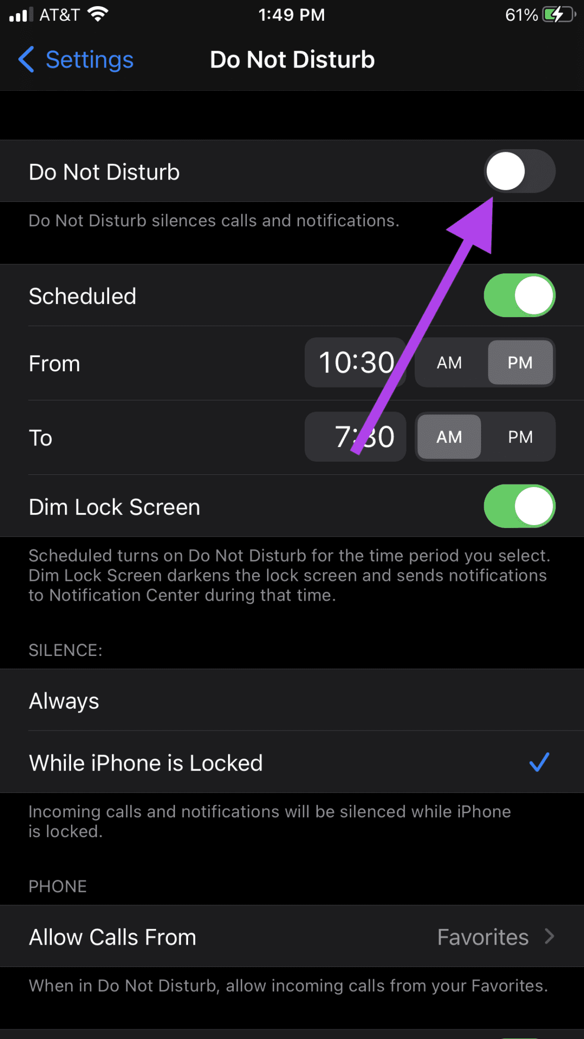 Шаг 2: Посмотрите на свой Не беспокойте время окончания. Это происходит после вашего Спать время приложения заканчивается? Если это так, вам может потребоваться настроить Не беспокойте время, чтобы соответствовать, или вы можете отключить запланированную активацию, выключив ее.