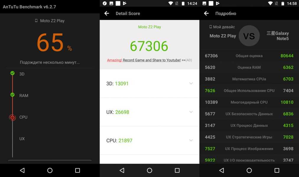 Moto Z Play не является исключением – оболочка летает, при серфинге интернета отсутствуют даже малейшие подлагивания, без проблем работают ресурсоемкие приложения и 3D игры. Косяков за смартфонов не замечено и при воспроизведении 4К видео. В бенчмарке Moto Z Play набирает 62.5 тыс. попугаев. Для повседневных задач 3 ГБ ОЗУ хватает с запасом, а внутреннее хранилище на 32 ГБ можно расширить флешками объемом до 256 ГБ.