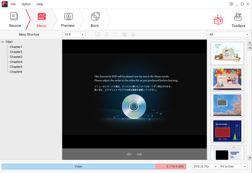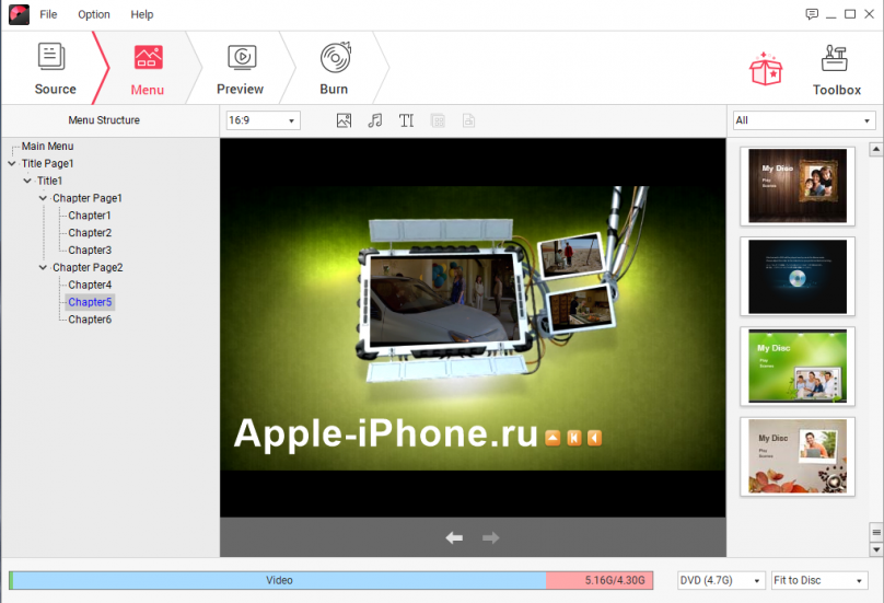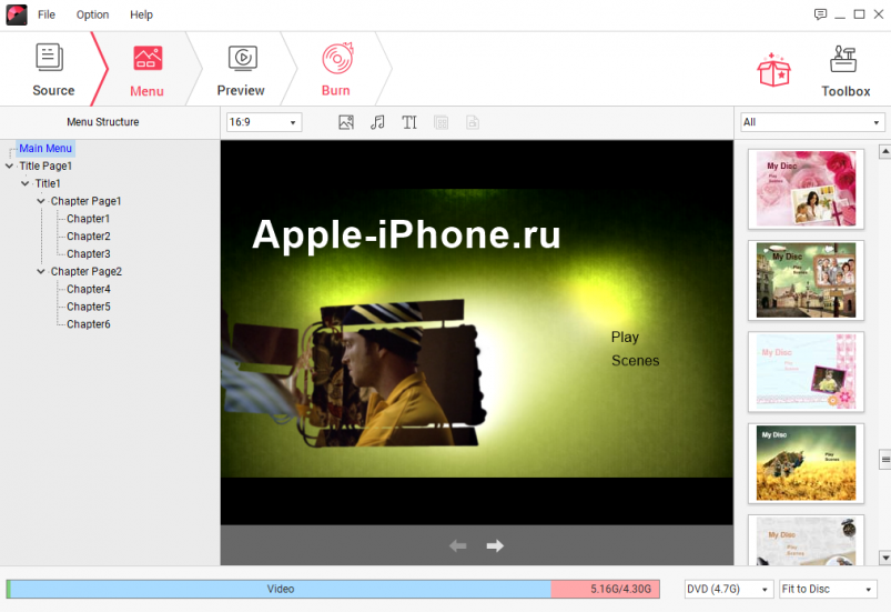 С помощью DVDStyler можно записывать все виды видеофайлов, а также добавить стильное меню. Софт предоставляет несколько готовых шаблонов, которые вы сможете настроить под свою задумку.
