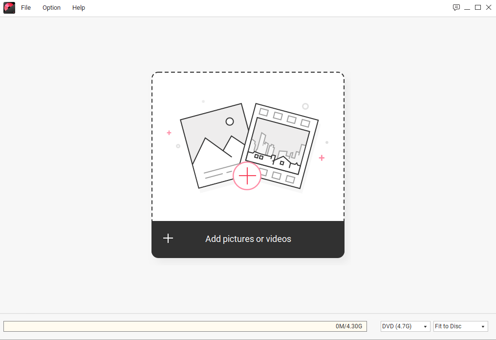 Просто добавляйте файлы кнопками «Add pictures or videos» и «Add title«, следя за полоской внизу — если диск переполнится, запись будет невозможна. Созданный проект можно сохранить, чтобы продолжить работу позже (см. меню File).