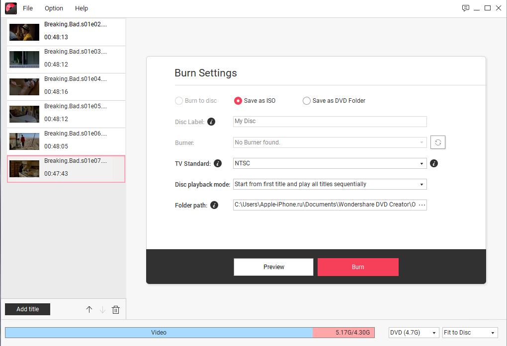 Wondershare DVD Creator решает эту проблему в корне. Утилита принимает видео в любом формате и конвертирует его именно в совместимый с DVD-плеером формат. Программа поддерживает более 150 форматов, включая BDMV Folder и DVDMedia, с которыми у аналогичных утилит постоянно возникают проблемы. Более того, Wondershare DVD Creator позволяет сохранить любой контент в форматах ISO или DVD прямо на компьютере для последующей быстрой записи на диск.