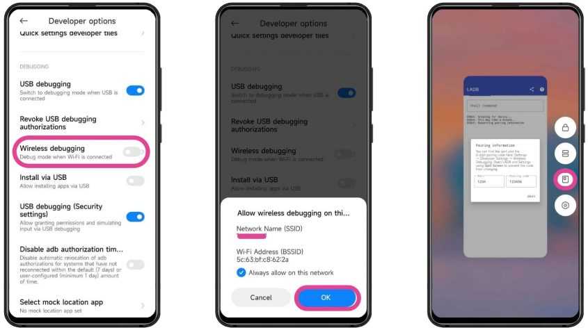 Откройте настройки, перейдите к параметрам разработчика и включите беспроводную отладку. Чтобы включить её, необходимо подключиться к сети Wi-Fi. После этого запустите приложение LADB и придайте ему вид «Плавающего окна».