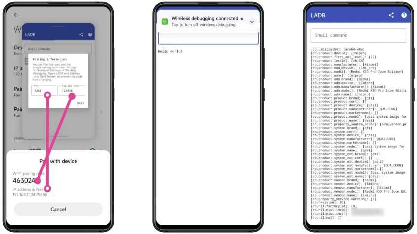 Теперь перейдите в меню Wireless Debugging и нажмите Pair device with pairing code. Впишите IP-адрес и порт из раздела IP address & Port в окно сопряжения приложения LADB. После этого придёт уведомление Wireless Debugging Connected. Теперь мы можно использовать команды ADB на LADB.