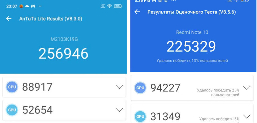 Redmi Note 10T (слева) и Redmi Note 10 (справа). Тест AnTuTu.