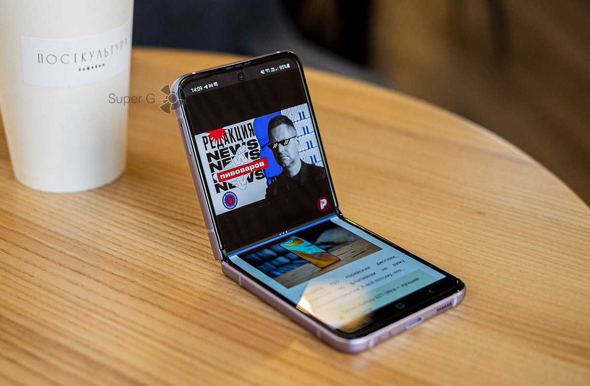 Но самое интересное — это съемка в сложенном виде. При сгибании смартфона подключается режим Flex, в котором можно перенести видоискатель на одну половинку, используя вторую как подставку — отличный вариант, если надо снять видео на фронтальную камеру, но под рукой нет штатива.