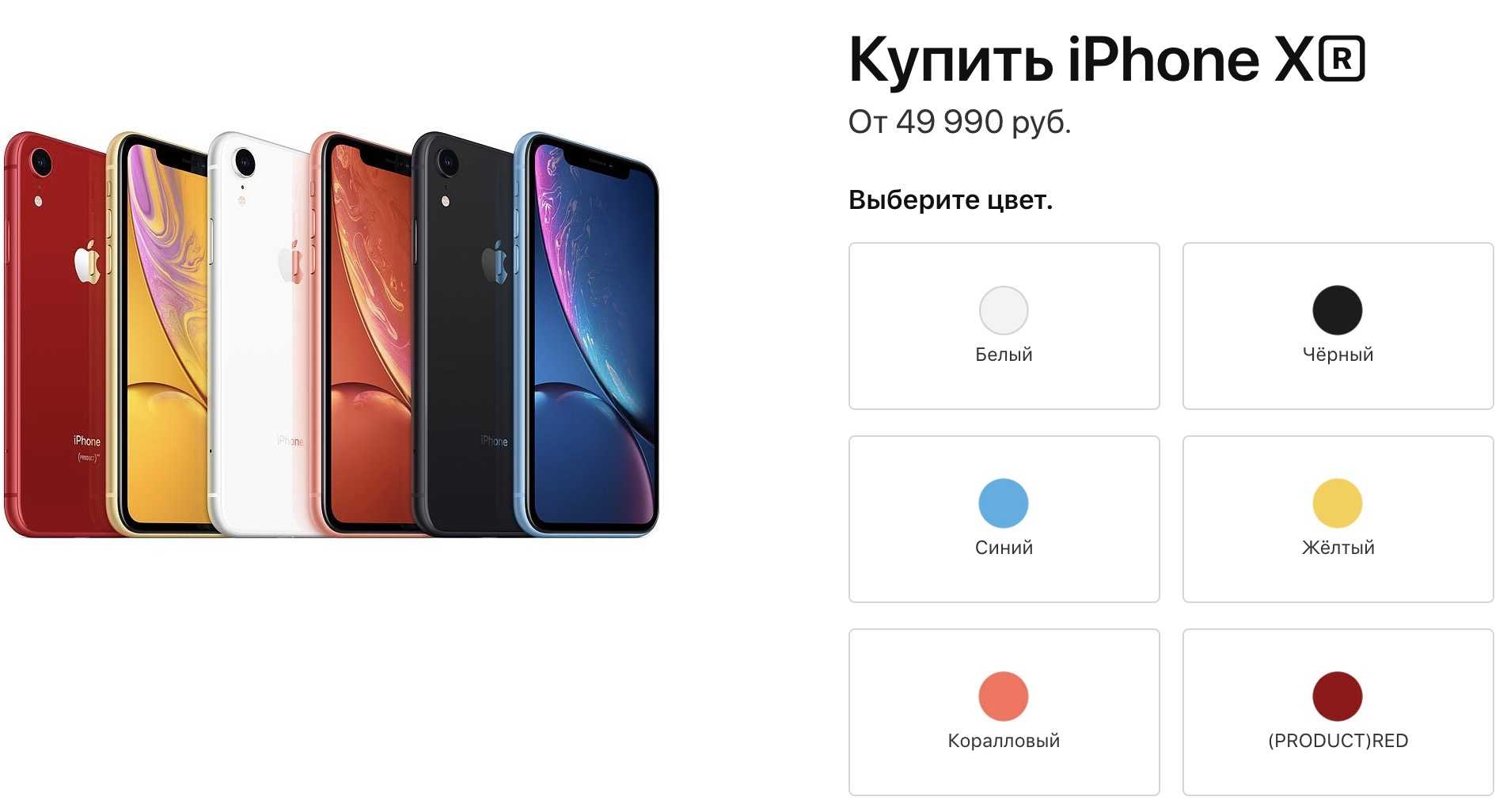 iPhone Xr доступен в 6 цветах: КРАСНЫЙ, Желтый, Белый, Коралловый, Черный и Синий.