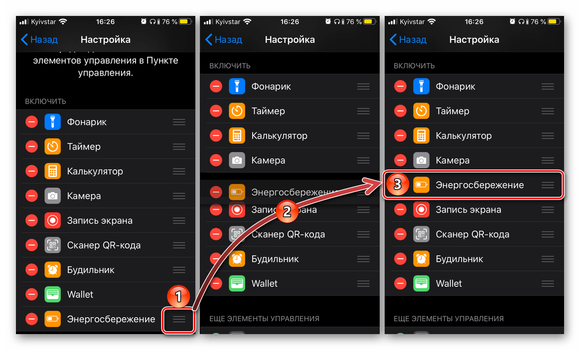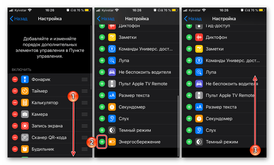 Если использование режима энергосбережения не является разовой необходимостью и активировать его требуется довольно часто, можно немного упростить алгоритм выполнения данного действия, сократив количество шагов буквально до двух. Для этого достаточно добавить кнопку включения в пункт управления (ПУ).