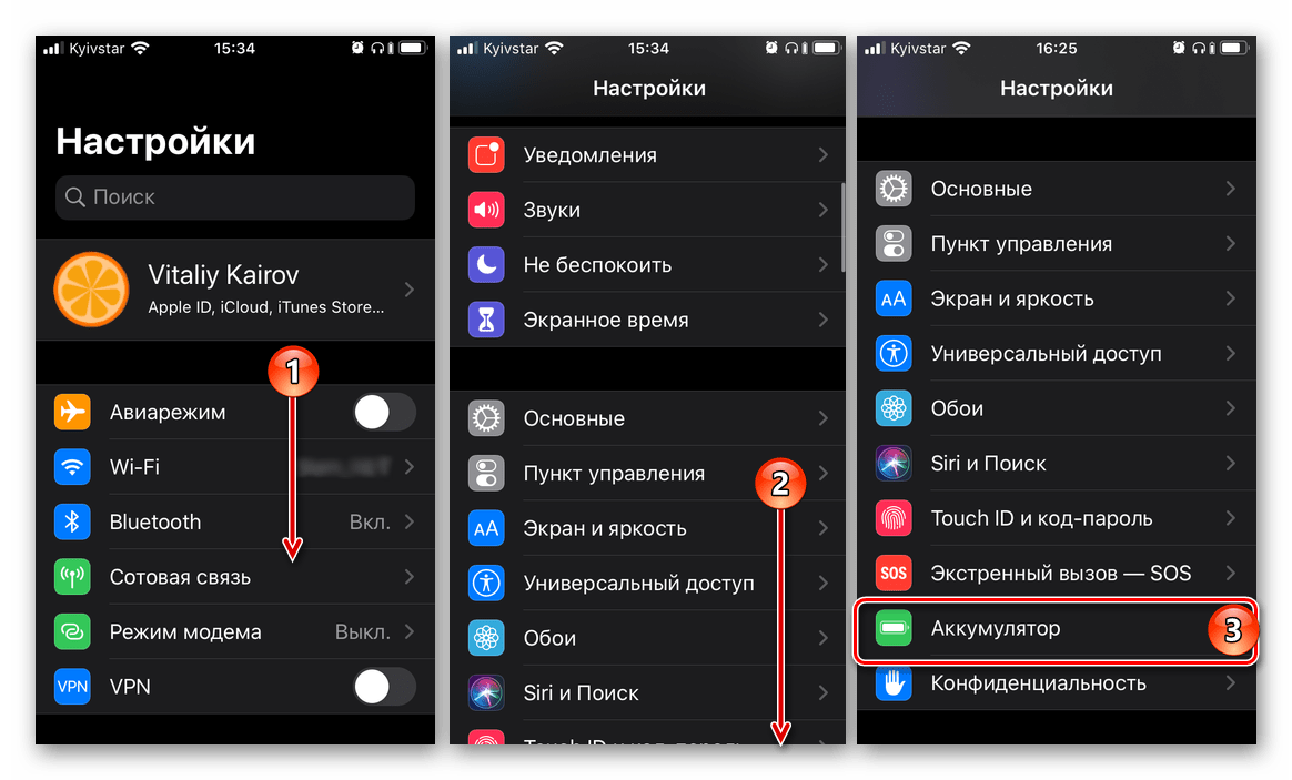 - Откройте «Настройки» айФон, пролистайте их немного вниз и тапните по пункту «Аккумулятор».