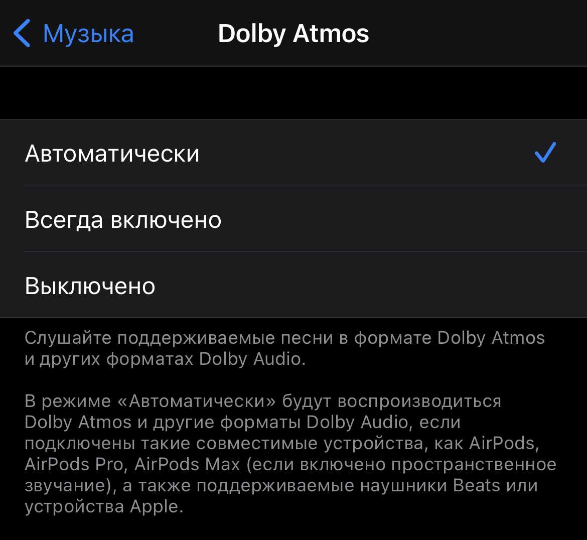 Если у вас наушники из списка выше, то подойдёт вариант «Автоматически». Режим «Всегда включено» активируется, когда у вас другие наушники. Но это будет имитация Dolby Atmos и, скорее всего, довольно посредственная, о чём свидетельствует предупреждение: