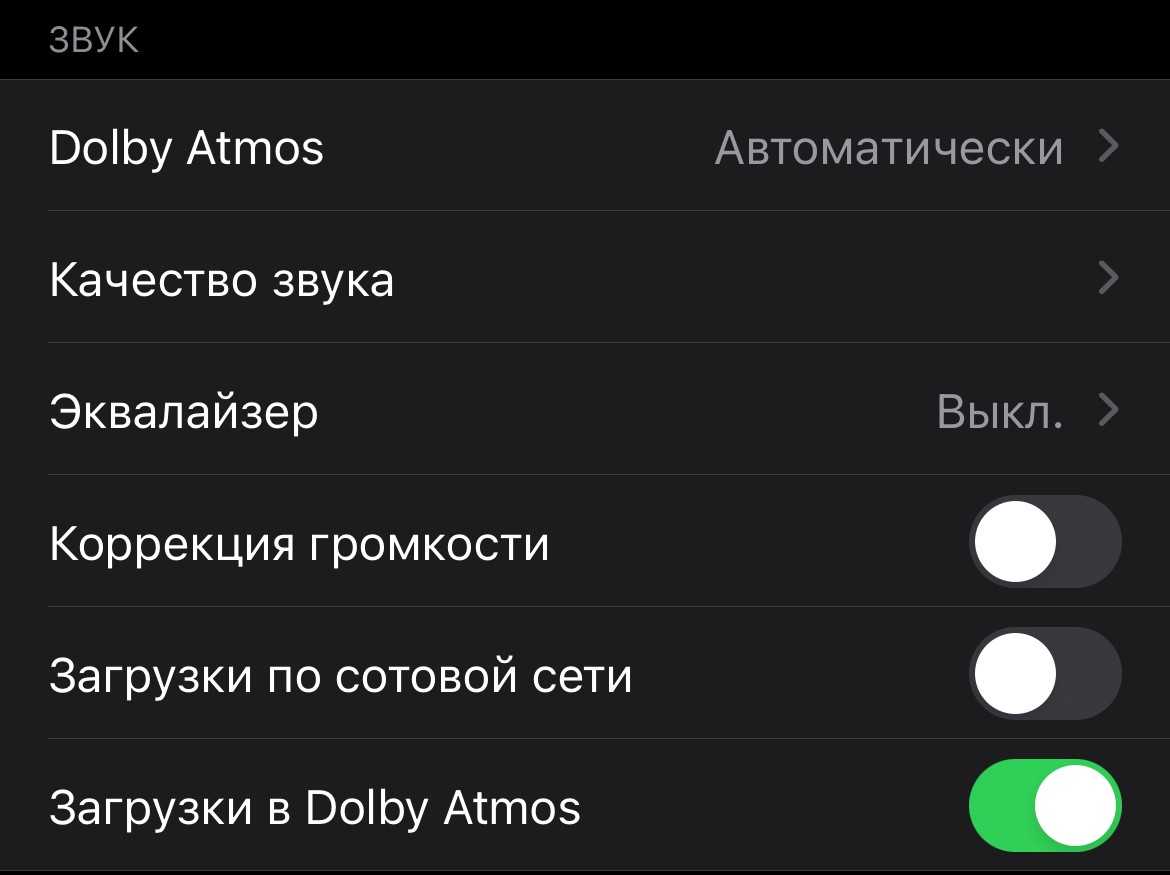 Пространственное аудио в плейлистах помечено значком Dolby Atmos. При активации этой технологии создаётся ощущение эффекта присутствия, которого можно достичь лишь с помощью систем вроде 5.1 или 7.1. По задумке, музыка, изначально сведённая для двух каналов, будет звучать так, будто бы вы находитесь в одном помещении с артистами, расположенными по всей комнате.