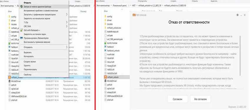 Теперь открываем программу Ми Анлок от имени администратора, видим белый экран с текстом на китайском языке (если локализованная версия как у меня — то на русском), где указаны правила отказа от ответственности. Соглашаемся и кликаем на соответствующую кнопку.