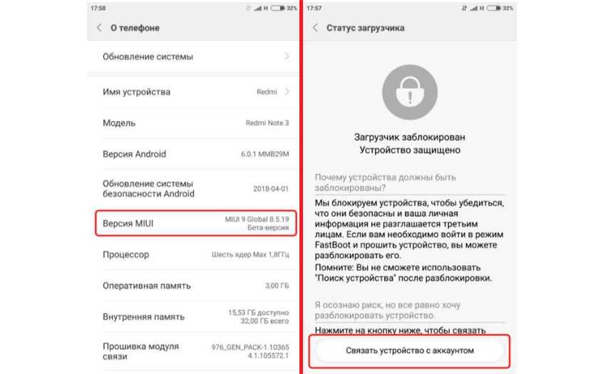 Включаем мобильный интернет. Далее открываем настройки смартфона, находим пункт «Об устройстве» и 5-7 раз быстро нажимаем «Версия MIUI». Это действие позволяет открыть доступ к скрытым по умолчанию опциям телефона. Далее последовательно открываем «Расширенные настройки» – «Для разработчиков» – «Статус загрузчика», затем связываем аккаунт с девайсом. После этого на экране появляется сообщение о завершении привязки.