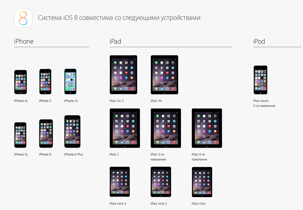 Apple заявляет, что следующие смартфон совместимые с iOS 8: iPhone: iPhone 4s, iPhone 5, iPhone 5c, iPhone 5s, iPhone 6, iPhone 6 Plus, iPod touch все поколения, iPad 2, iPad 3, iPad 4, iPad Air, iPad mini, iPad mini с Retina дисплеем.