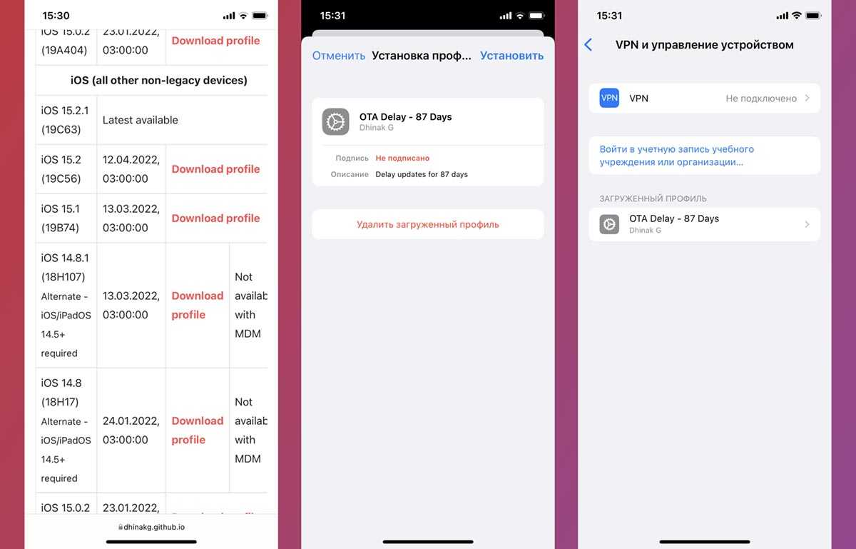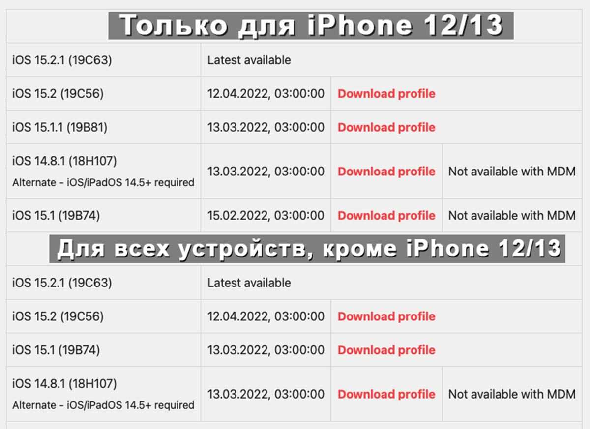 Перейти на сайт проекта DelayOTA. Здесь вы увидите профили версий iOS, до которых вы можете обновиться прямо сейчас. Рядом с каждым обновлением указана дата, до которой оно будет доступно. Выберите нужную прошивку и загрузите соответствующий профиль