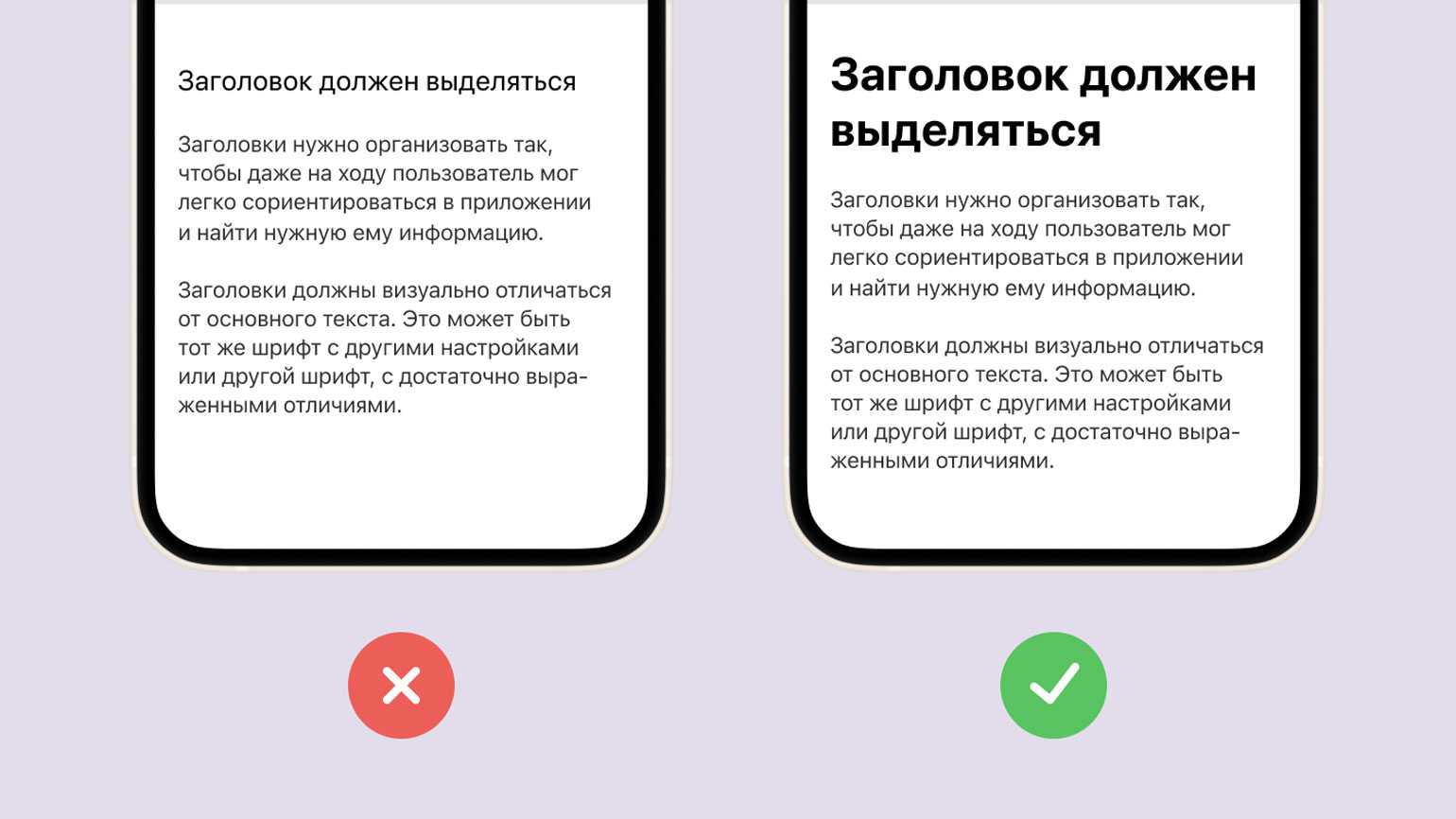 Информацию важно организовать так, чтобы даже на ходу пользователь мог легко сориентироваться в приложении и найти необходимое. Для этого используют заголовки — они помогают пользователю быстро понять, что ему нужно