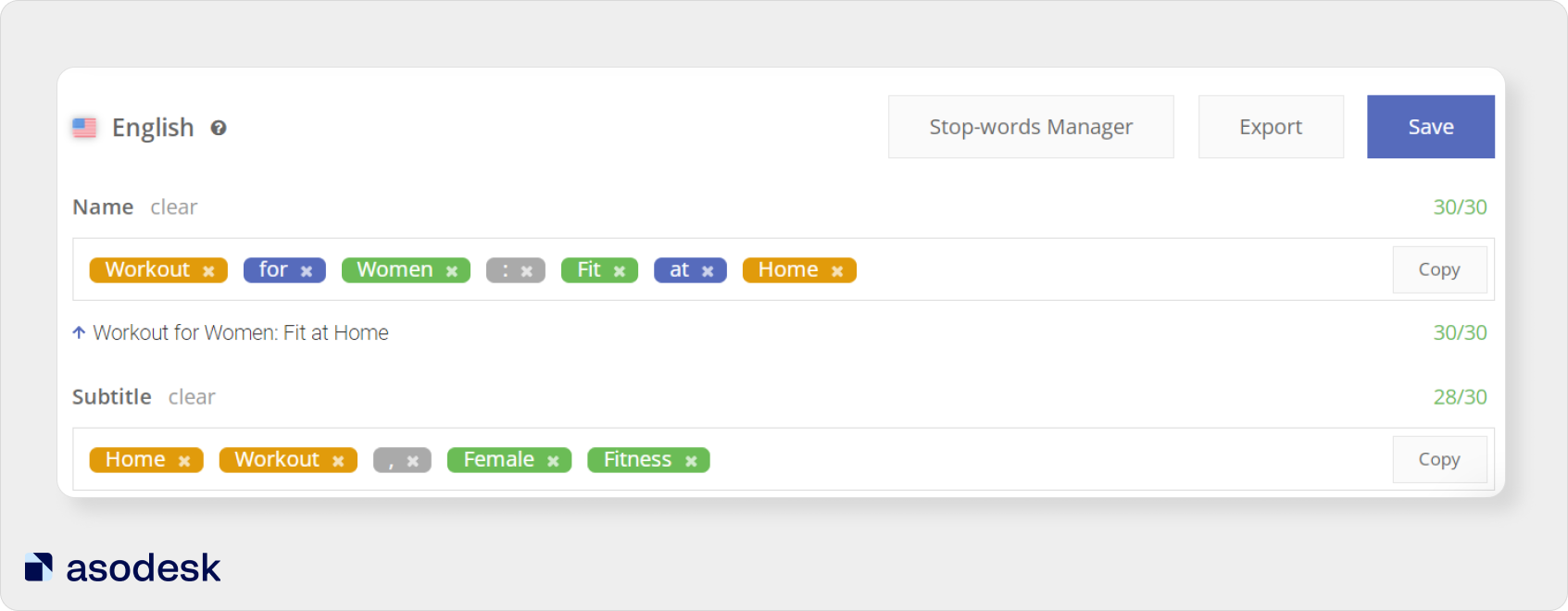Инструмент Optimizer в Asodesk выделит ключевые слова, которые вы повторили в заголовке и подзаголовке приложения.